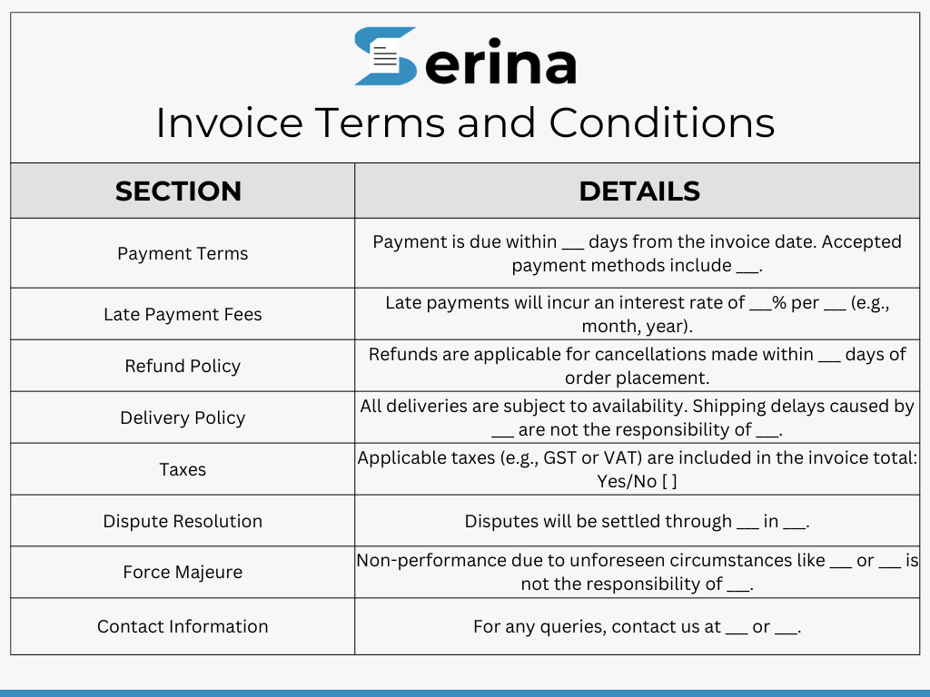 - Footer Section: Add a concise version of your terms and conditions in the footer of the invoice.